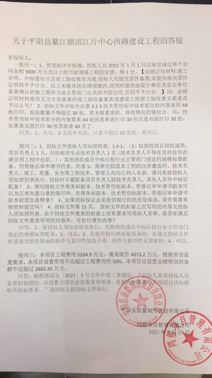 关于平阳县鳌江镇滨江片中心西路建设工程的答疑
