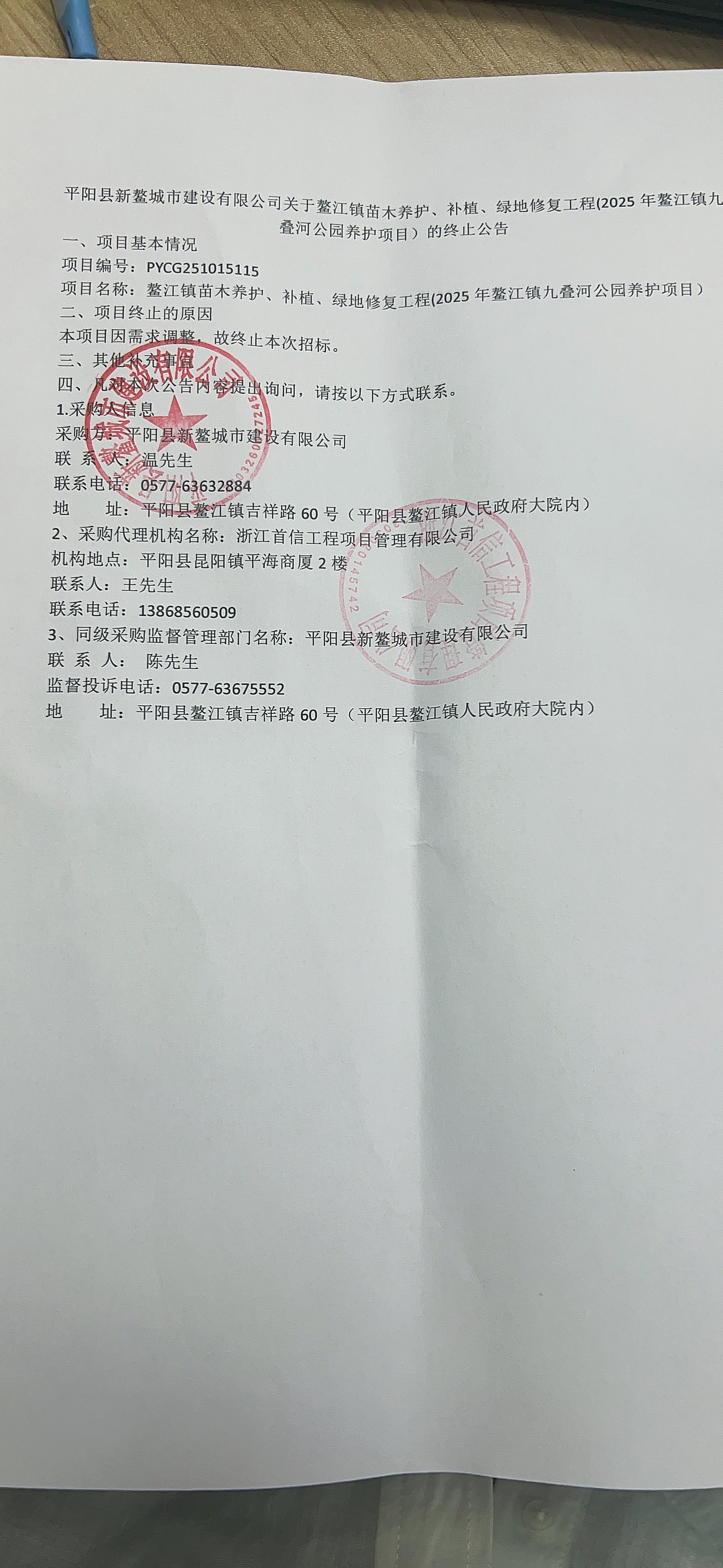 平阳县新鳌城市建设有限公司关于鳌江镇苗木养护、补植、绿地修复工程(2025年鳌江镇九叠河公园养护项目)的终止公告