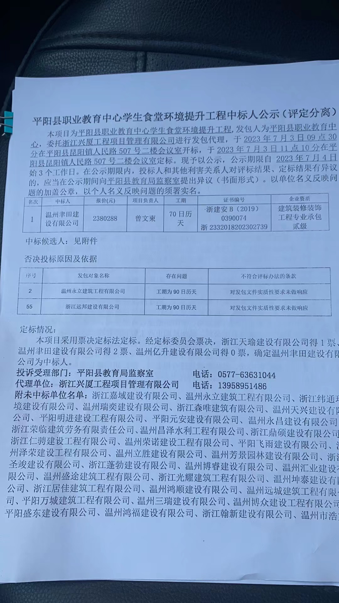 本项目为平阳县职业教育中心学生食堂环境提升工程,发包人为平阳县职业教育中心,委托浙江兴厦工程项目管理有限公司进行发包代理,于2023年7月3日09点30分在平阳县昆阳镇人民路507号二楼会议室开标,于2023年7月3日11点10分在平阳县昆阳镇人民路507号二楼会议室定标。现予以公示,公示期限自 2023年7月4日始3个工作日。在公示期限内,投标人和其他利害关系人对评标结果、定标结果有异议的,应当在公示期间向平阳县教育局监察室提出异议(书面形式)。以单位名义反映问题的加盖公章,以个人名义反映问题的须署实名。