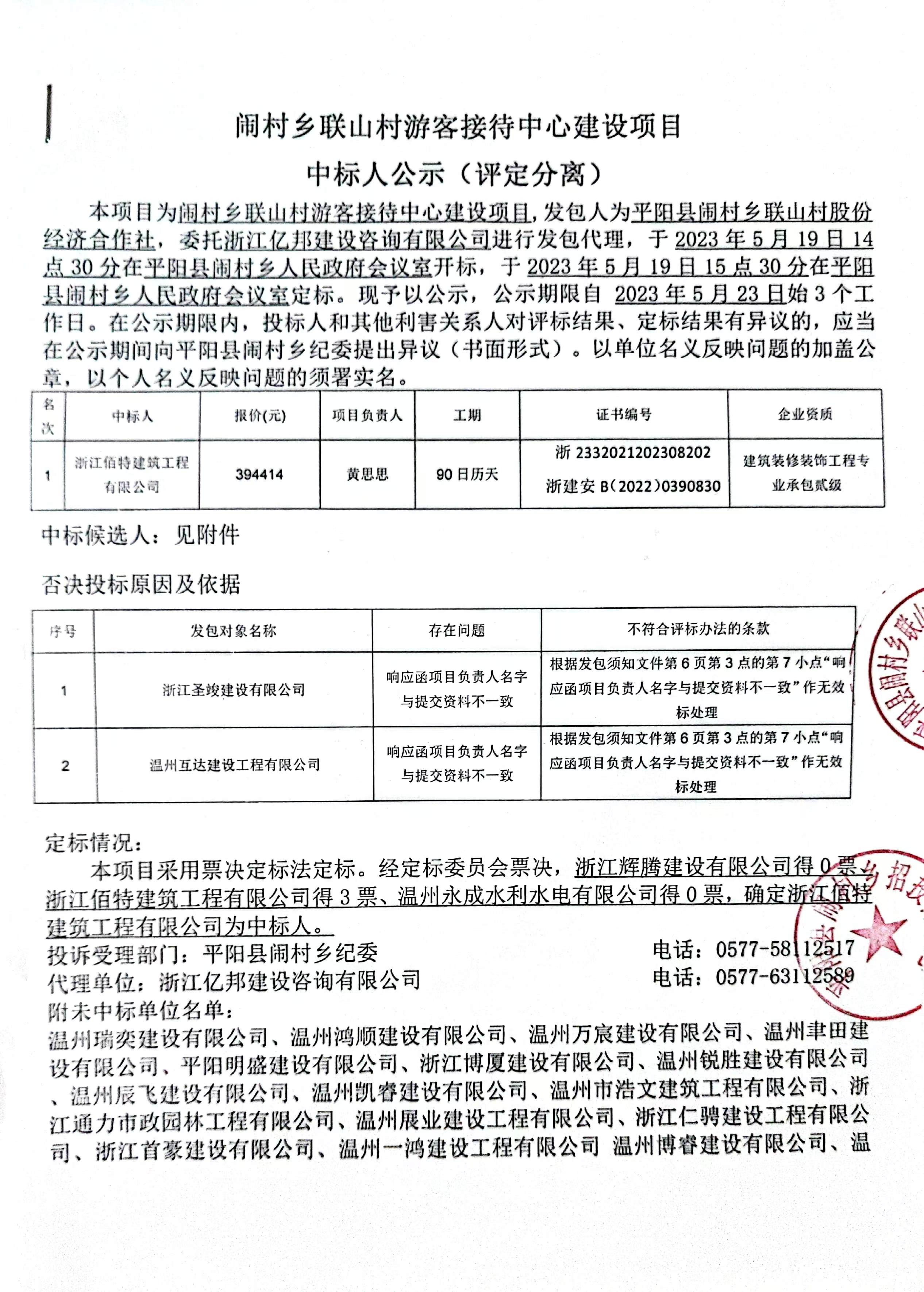 本项目为闹村乡联山村游客接待中心建设项目,发包人为平阳县闹村乡联山村股份经济合作社,委托浙江亿邦建设咨询有限公司进行发包代理,于2023年5月19日14点30分在平阳县闹村乡人民政府会议室开标,于2023年5月19日15点30分在平阳县闹村乡人民政府会议室定标。现予以公示,公示期限自 2023年5月23日始3个工作日。在公示期限内,投标人和其他利害关系人对评标结果、定标结果有异议的,应当在公示期间向平阳县闹村乡纪委提出异议(书面形式)。以单位名义反映问题的加盖公章,以个人名义反映问题的须署实名。