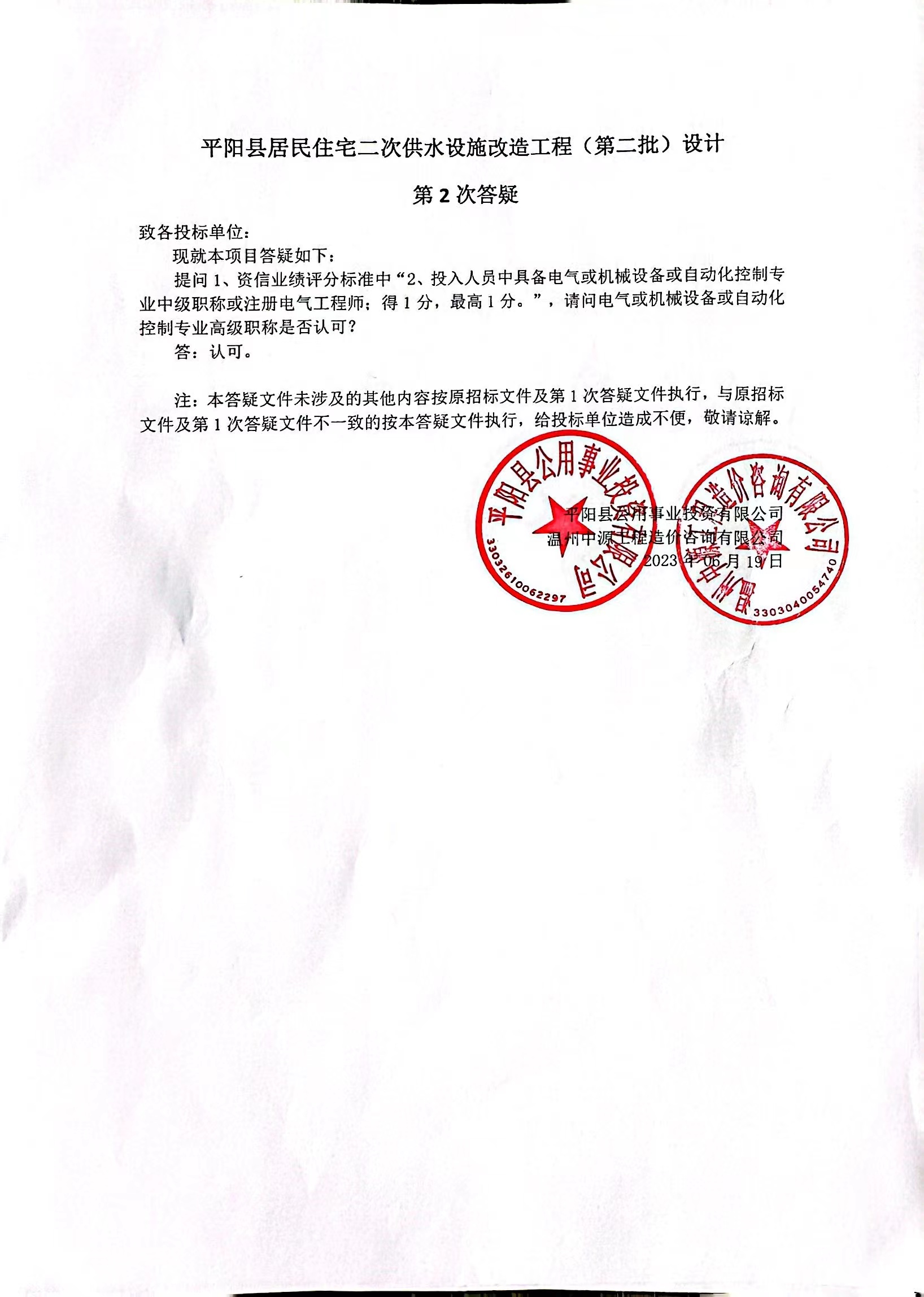 平阳县居民住宅二次供水设施改造工程(第二批)设计 第2次答疑 致各投标单位: 现就本项目答疑如下: 提问1、资信业绩评分标准中“2、投入人员中具备电气或机械设备或自动化控制专业中级职称或注册电气工程师;得1分,最高1分。”,请问电气或机械设备或自动化控制专业高级职称是否认可? 答:认可。 注:本答疑文件未涉及的其他内容按原招标文件及第1次答疑文件执行,与原招标文件及第1次答疑文件不一致的按本答疑文件执行,给投标单位造成不便,敬请谅解。 平阳县公用事业投资有限公司 温州中源工程造价咨询有限公司 2023年06月19日